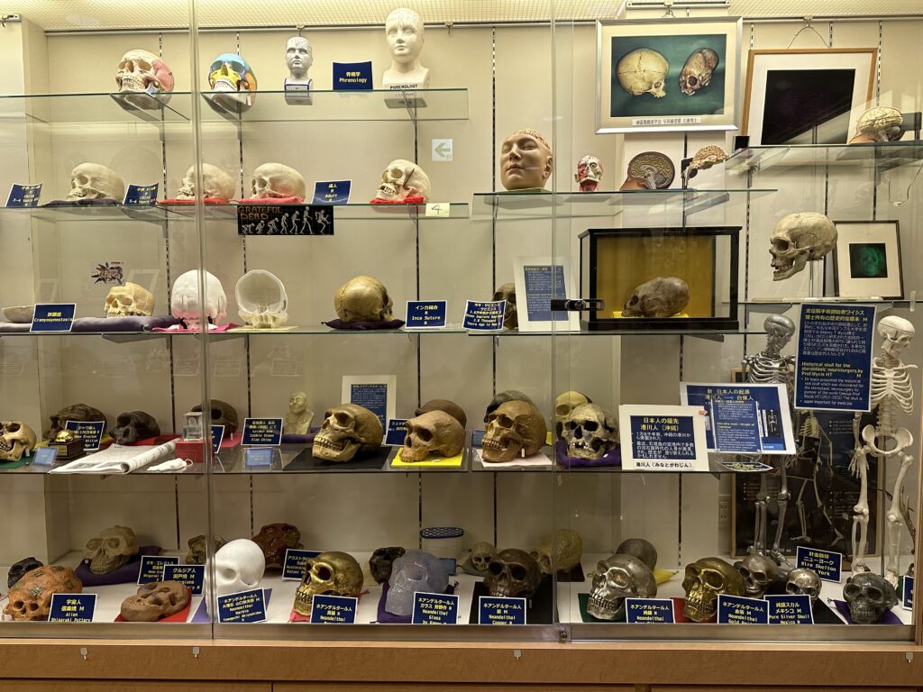 3年かけて1本の桐の木をくり抜いて作成され、内部も解剖学的に正確な世界最大の木製頭蓋骨、胎児から成人までの頭蓋骨の変遷、狭頭症・水頭症の頭蓋骨、古代ペルーの変形頭蓋骨や、古代宗教的な儀式で使われていた頭蓋杯など、他ではみられない学術的な価値のある頭蓋骨が多く展示されています。